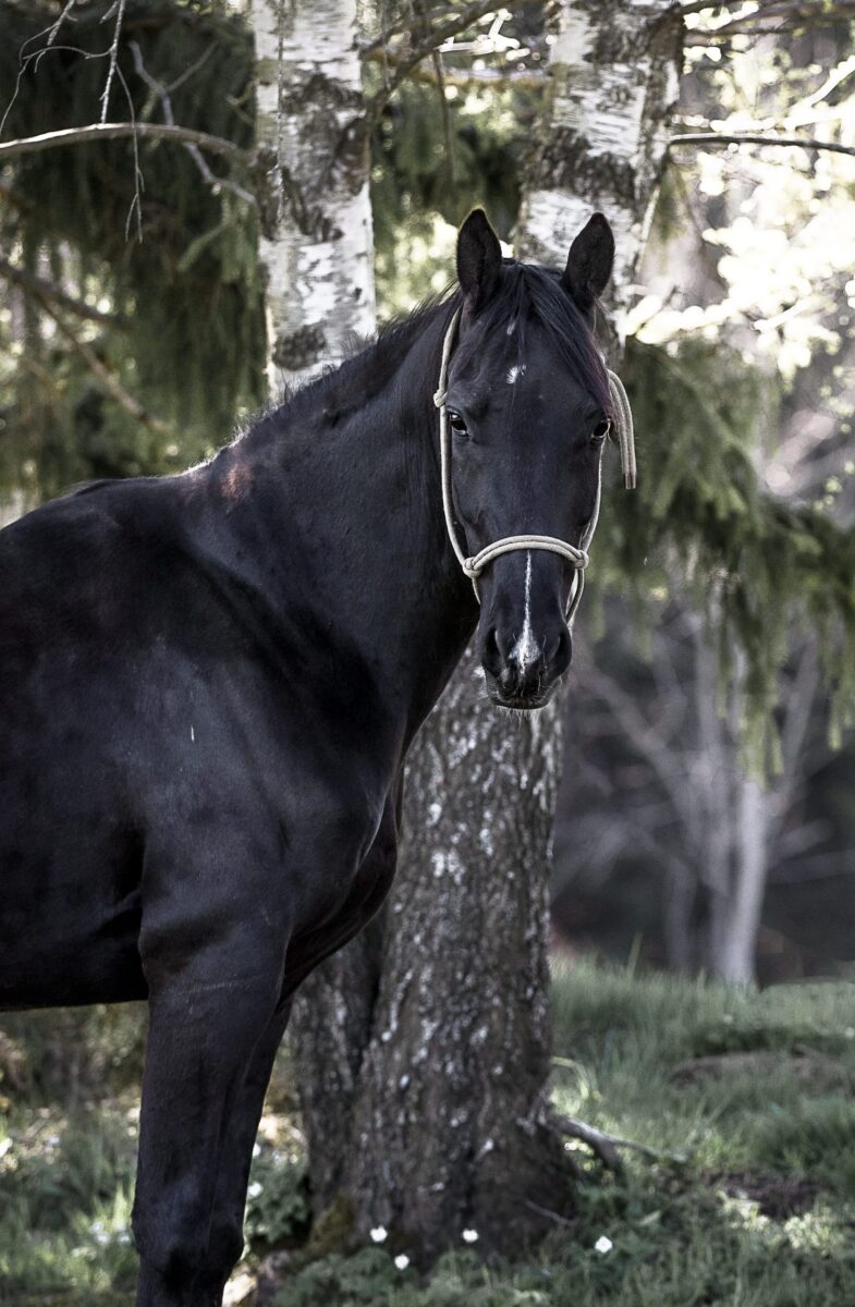 Er wird von uns mit Bosal ausgebildet und kennt Doppellonge und die Arbeit vom Boden.